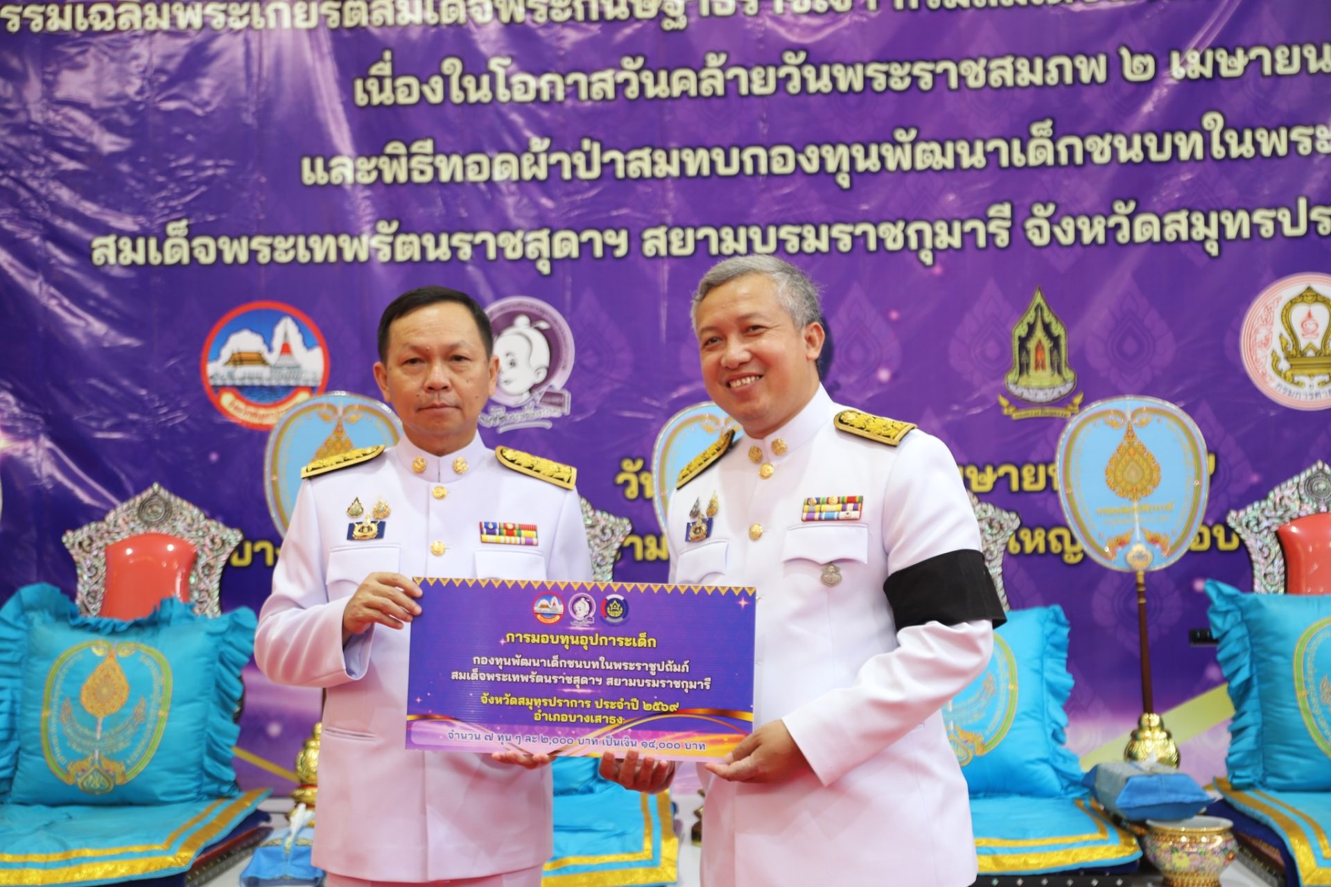 สำนักงานพัฒนาชุมชนจังหวัดสมุทรปราการ จัดพิธีทอดผ้าป่าสมทบกองทุนพัฒนาเด็กชนบท ในพระราชูปถัมภ์สมเด็จพระเทพรัตนราชสุดาฯ สยามบรมราชกุมารี จังหวัดสมุทรปราการ เพื่อจัดหาทุนในการช่วยเหลือเด็กด้อยโอกาส