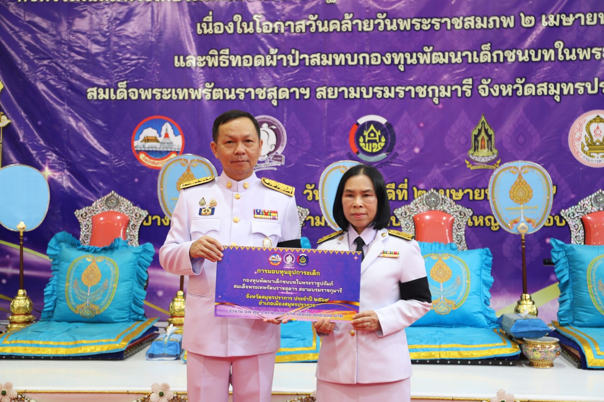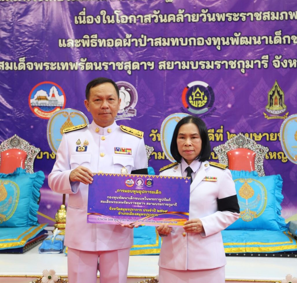 สำนักงานพัฒนาชุมชนจังหวัดสมุทรปราการ จัดพิธีทอดผ้าป่าสมทบกองทุนพัฒนาเด็กชนบท ในพระราชูปถัมภ์สมเด็จพระเทพรัตนราชสุดาฯ สยามบรมราชกุมารี จังหวัดสมุทรปราการ เพื่อจัดหาทุนในการช่วยเหลือเด็กด้อยโอกาส